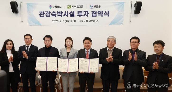 전국신문언론노동조합 김성길 기자 | 충북도는 3일 도청 여는마당에서 충청북도와 보은군, 라미드그룹간 보은 구병산관광지 내 관광숙박시설 및 부대시설 투자 협약식을 개최했다고 밝혔다.