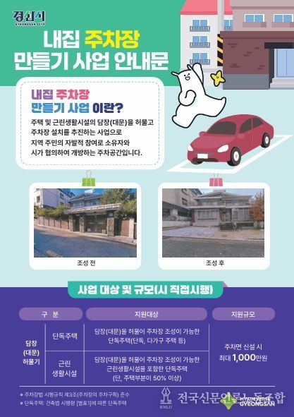 전국신문언론노동조합 강찬희 기자 | 경산시는 주택 밀집 지역의 주차난을 해소하고 쾌적한 주거환경을 조성하기 위해 '2026년 내 집 주차장 만들기 시범 사업'을 추진하고 27일까지 신청을 받는다.