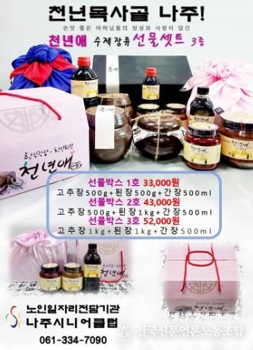 전국신문언론노동조합 강찬희 기자 | 전라남도가 설을 앞두고 어르신이 직접 생산하고 가공한 생산품을 판매하는 ‘은빛장터’ 할인 기획전을 전남도 온라인 쇼핑몰 ‘남도장터’에서 추진한다.