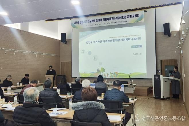 전국신문언론노동조합 강찬희 기자 | 함안군은 지난 3일 가야읍 어울림센터 1층 어울림홀에서 농촌공간의 체계적인 발전과 지속 가능한 농촌 조성을 위한 ‘농촌공간 재구조화 및 재생 기본계획(안)’ 주민공청회를 열고 주민 의견 수렴에 나섰다고 밝혔다.