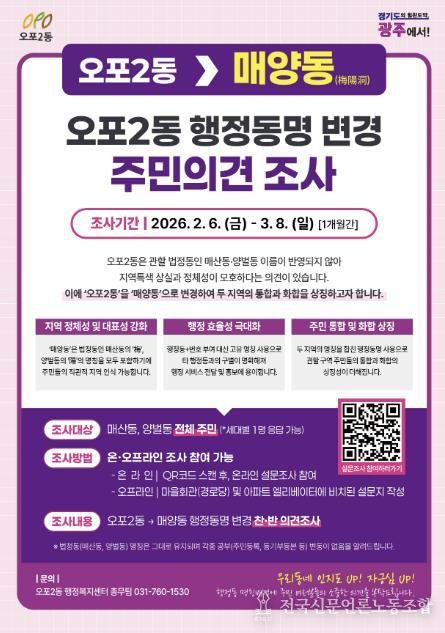 전국신문언론노동조합 김성길 기자 | 광주시 오포2동은 지역 정체성을 반영한 행정동 명칭 변경을 위해 2월 6일부터 3월 8일까지 오포2동 전 세대를 대상으로 주민 의견 조사를 실시한다고 4일 밝혔다.
