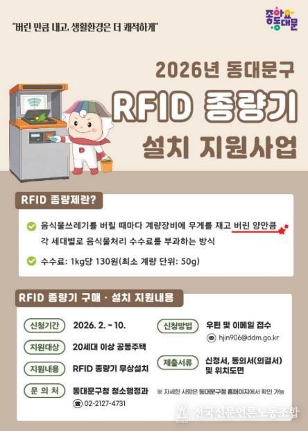 전국신문언론노동조합 강찬희 기자 | 동대문구는 음식물류 폐기물을 줄이고 쾌적한 주거환경을 만들기 위해 ‘2026년 공동주택 음식물 쓰레기 RFID 종량기 설치 지원 사업’을 확대 추진한다.
