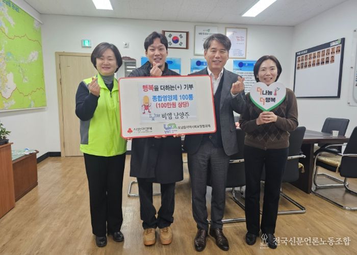 전국신문언론노동조합 김성길 기자 | 남양주시는 4일 유통 전문회사 비엠 남양주가 지역 내 취약계층을 위해 마련한 종합영양제 100통을 오남읍 지역사회보장협의체에 전달했다고 밝혔다.