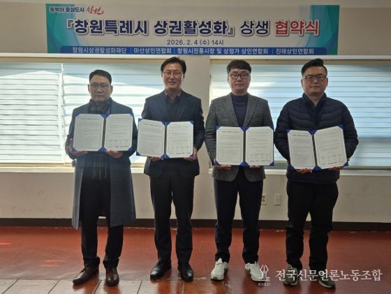 전국신문언론노동조합 강찬희 기자 | 창원시상권활성화재단(이사장 장금용)은 2월 4일 오후 2시, 창원시상권활성화재단 어울림센터에서 마산통합상인연합회, 창원시 전통시장 및 상점가 상인연합회, 진해상인연합회(대표시장: 진해중앙시장)와 '창원특례시 상권활성화'를 위한 상생 업무협약을 체결했다.
