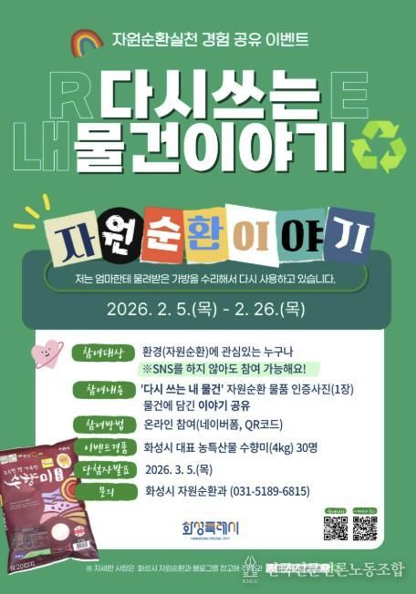전국신문언론노동조합 김성길 기자 | 화성특례시는 시민들이 일상에서 실천하고 있는 자원순환 경험을 공유하는 참여형 캠페인 '다시쓰는 내 물건 이야기' 를 운영한다.