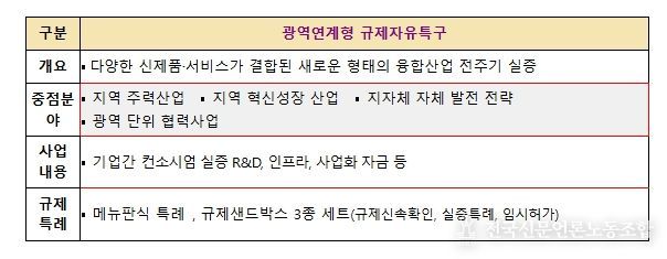 ‘광역연계형 규제자유특구’는 2개 이상의 지방자치단체가 연계·협력하여 특구를 공동 기획·운영하는 방식으로, 다양한 신제품·서비스가 결합된 형태의 융합 산업을 실증하는 새로운 유형의 규제자유특구 모델이다. 이를 통해 개별 지자체 단위에서 추진이 어려웠던 대규모·복합 실증이 가능해질 것으로 기대된다.