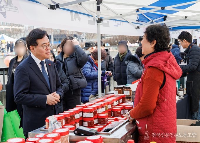 이날 진 구청장은 장터 내 점포 곳곳을 들려 임실치즈, 밀양딸기 등 지역 농특산물을 직접 구입하고 상인들과 장을 보러 나온 주민들에게 다가가 친근하게 새해 인사를 나눴다.