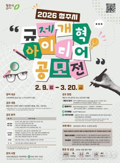 전국신문언론노동조합 김성길 기자 | 청주시는 시민이 체감할 수 있는 다양하고 창의적인 규제개혁 아이디어를 발굴해 일상생활과 경제활동을 제약하는 규제를 적극 개선하고자 ‘2026 청주시 규제개혁 아이디어 공모전’을 개최한다고 8일 밝혔다.