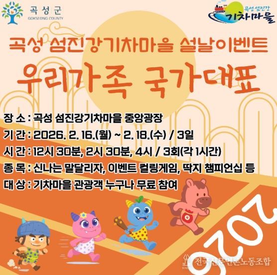 전국신문언론노동조합 강찬희 기자 | 곡성군은 설명절 연휴 기간 중 2월 16일부터 18일까지 3일간 섬진강기차마을 중앙광장에서 방문객들을 위한 특별 이벤트를 운영한다고 6일 밝혔다.