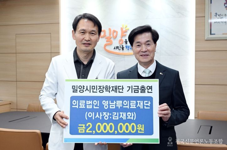 전국신문언론노동조합 강찬희 기자 | (재)밀양시민장학재단(이사장 안병구)은 10일 의료법인 영남루의료재단(이사장 김재화)과 대한숙박업중앙회 밀양시지부(지부장 조희선)에서 지역 교육 발전을 위한 장학기금으로 각각 200만원과 300만원을 기탁했다고 밝혔다.