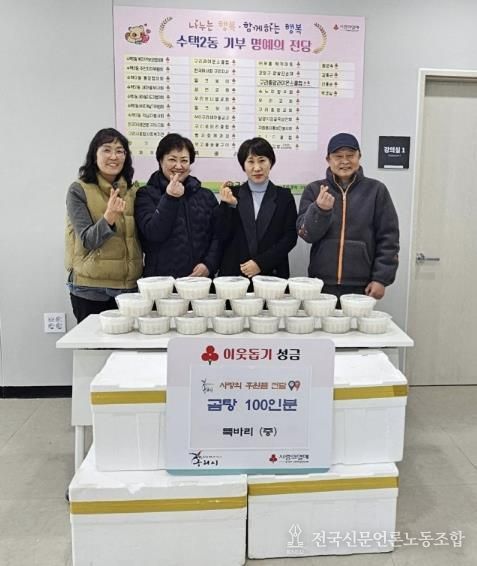 전국신문언론노동조합 김성길 기자 | 구리시 수택2동 행정복지센터는 지난 2월 9일, 지역 음식점 뚝바리로부터 설 명절을 맞아 설렁탕 100인분을 후원받아 관내 저소득 취약계층에 전달했다고 밝혔다.