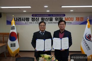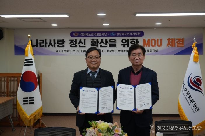 전국신문언론노동조합 강찬희 기자 | 경상북도인재개발원(원장 우광진)과 (재)경상북도호국보훈재단(대표이사 한희원)은 2월 10일 오후 2시, (재)경상북도호국보훈재단 국민대표회의실에서 나라사랑 정신을 계승·확산하기 위한 업무협약(MOU)을 체결했다.