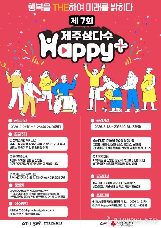 전국신문언론노동조합 강찬희 기자 | 제주삼다수를 생산·유통하는 제주특별자치도개발공사(사장 백경훈)는 도내 복지 사각지대 해소를 위한 혁신적인 아이디어를 발굴하는 ‘제7회 제주삼다수 Happy+ 복지 지원사업’의 공모 접수가 오는 25일 마감된다고 밝히며, 도내 역량 있는 단체들의 적극적인 참여를 독려했다.