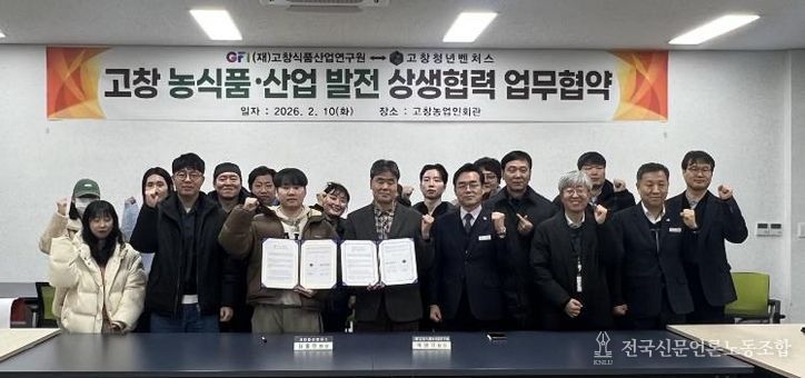 전국신문언론노동조합 강찬희 기자 | (재)고창식품산업연구원과 고창청년벤처스가 지난 10일 저녁 고창군농업인회관에서 고창군의 지속 가능한 발전과 청년 창업 생태계 활성화를 위한 업무협약(MOU)을 체결했다고 밝혔다.