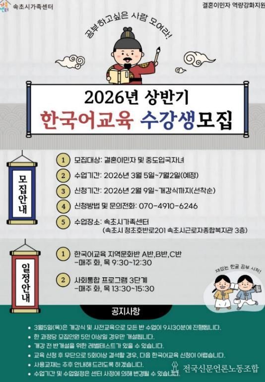 전국신문언론노동조합 강찬희 기자 | 속초시가족센터가 속초시에 거주하는 결혼이민자의 지역사회 정착과 자립을 돕기 위해 상반기 한국어 교육과 운전면허 취득 지원사업 참여자를 모집한다.