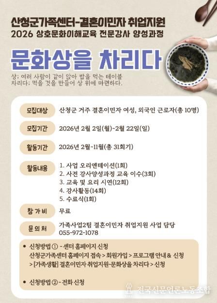 전국신문언론노동조합 강찬희 기자 | 산청군가족센터는 오는 22일까지 결혼이민자의 안정적인 사회 참여와 취업 역량 강화를 위해 '상호문화이해교육 강사양성과정'참여자를 모집한다고 10일 밝혔다.