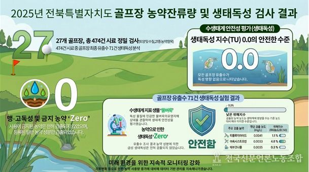 전국신문언론노동조합 강찬희 기자 | 전북특별자치도 보건환경연구원이 도내 골프장을 대상으로 실시한 농약 잔류량 검사에서 모든 골프장이 안전사용기준을 준수하고 있는 것으로 나타났다고 11일 밝혔다.