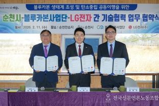 전국신문언론노동조합 강찬희 기자 | 순천시는 11일 순천만습지에서 서울대 블루카본사업단, LG전자(주)와 함께 '블루카본 생태계 조성 및 탄소중립 공동 이행을 위한 업무협약'을 체결했다고 밝혔다.