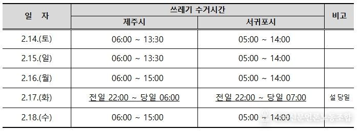 임홍철 제주도 기후환경국장은 “설 연휴에도 쓰레기 처리와 관련한 불편을 최소화하고 깨끗한 환경을 유지하기 위해 최선을 다하겠다”며 “쓰레기 줄이기와 올바른 분리배출 등 도민 여러분의 적극적인 협조를 당부드린다”고 밝혔다.