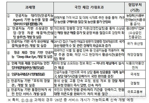 인공지능 민생 10대 과제(프로젝트)'는 국민 효능감이 높은 분야를 중심으로, 국민이 일상에서 인공지능을 체감할 수 있는 서비스를 빠르게 도입하여 인공지능 혁신의 혜택을 확산하기 위한 과제(프로젝트)이다. 공모 신청을 위한 구체적 지원 내용과 선정 절차 등 상세 내용은 과기정통부, 정보통신산업진흥원에서 확인할 수 있다.