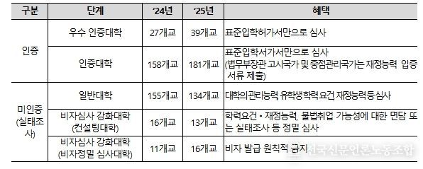 한편, 인증대학 외에 외국인 유학생이 1명 이상 재적 중인 대학에 대해서는 ‘유학생 유치‧관리 실태조사’를 실시하고, 일정 기준을 충족하지 못할 시 비자심사 강화대학(컨설팅대학, 비자정밀 심사대학)으로 지정했다. 이를 통해 대학이 외국인 유학생의 유치 단계에서 어학 능력과 재정 능력 등을 엄격히 심사하도록 하고, 유학생 관리 전반에 대한 대학의 책임을 강화할 예정이다.