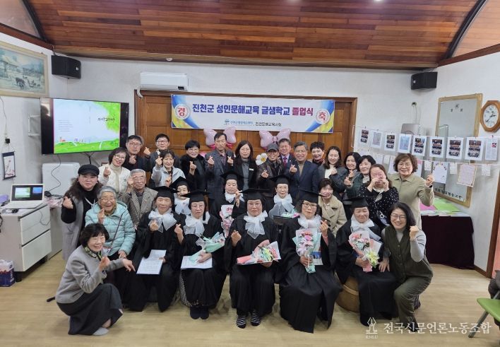 전국신문언론노동조합 김성길 기자 | 충북 진천군은 12일 백곡면 지곡마을 경로당에서 성인문해교육 프로그램 ‘찾아가는 마을학습장’ 졸업식을 개최했다.