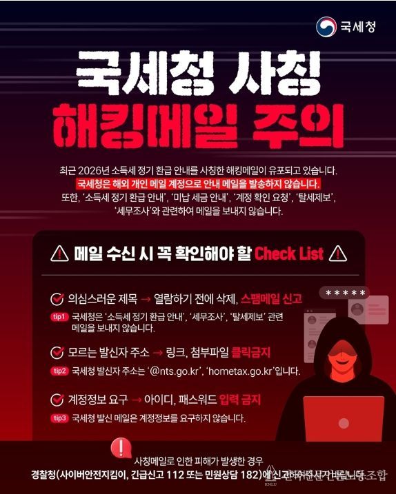 최근 2026년 소득세 정기 환급 안내를 사칭한 해킹메일이 유포되고 있습니다. 국세청은 해외 개인 메일 계정으로 안내 메일을 발송하지 않습니다. 또한, '소득세 정기 환급 안내', '미납 세금 안내', '계정 확인 요청', '탈세제보', '세무조사'와 관련하여 메일을 보내지 않습니다.
