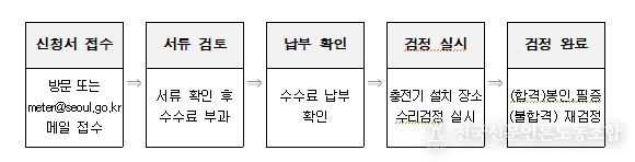 전기차 충전기 ‘수리검정’은 전기차 충전기의 계량 성능에 영향을 줄 수 있는 부분을 수리한 경우 계량값의 정확도를 검정하는 것으로, 산업통상부장관이 지정한 검정기관 및 지방자치단체가 수행할 수 있다. 검정기관은 주로 경기도에 소재하고 있으며, 지방자치단체 중에는 서울시가 최초로 시행한다.