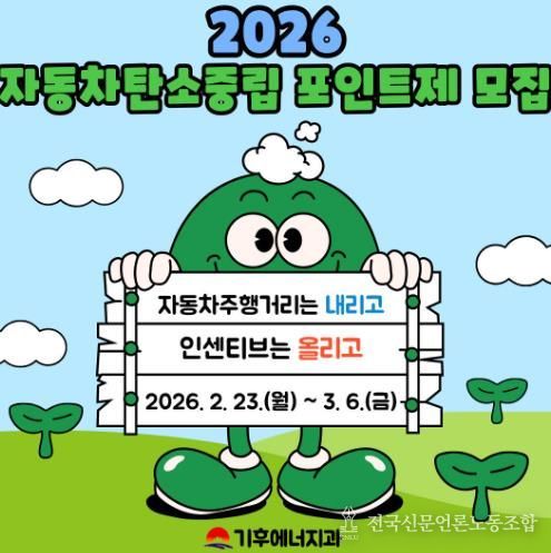 전국신문언론노동조합 강찬희 기자 | 김천시가 시민들의 자발적인 온실가스 감축을 유도하기 위해 '2026년 자동차 탄소중립포인트제'참여 차량 450대를 오는 2월 23일부터 3월 6일까지 선착순 모집한다고 밝혔다.