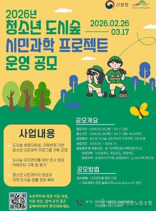 전국신문언론노동조합 강찬희 기자 | 산림청은 녹색자금(복권기금)을 활용해 ‘2026년 청소년 도시숲 시민과학 프로젝트’를 본격 추진한다고 20일 밝혔다.