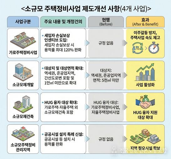 이번 개선 건의는 소규모주택정비사업을 촉진하기 위한 ▴사업 지연 방지(세입자 손실보상 인센티브) ▴사업 활성화 방안(사업 대상 확대, 융자지원) ▴지역 내 필요 시설 확보(공공기여) 등 3개 분야에서 이뤄졌다.
