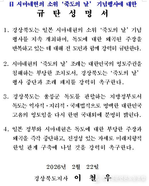 전국신문언론노동조합 강찬희 기자 | 경상북도는 22일, 일본 시마네현이 소위 ‘죽도의 날’ 행사 개최에 대해 강력히 규탄하며, 행사 즉각 중단과 관련 조례 폐지를 촉구했다.