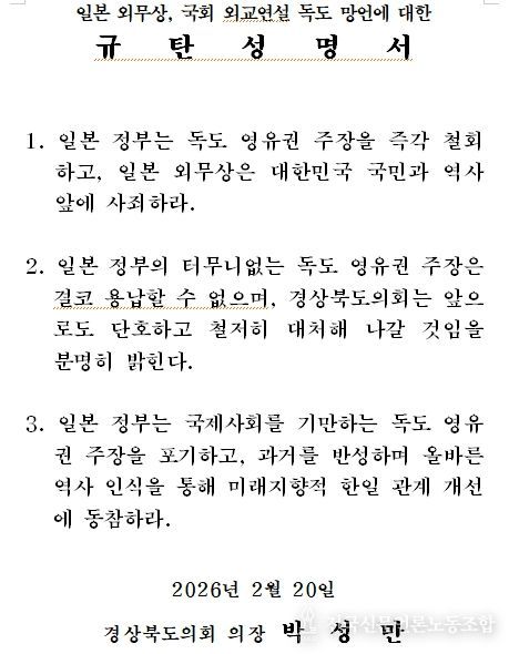 전국신문언론노동조합 강찬희 기자 | 경상북도의회는 20일, 모테기 도시미쓰 일본 외무상이 일본 국회에서 독도 영유권을 주장하는 망언을 한 데 대해 강력히 항의하며, 독도는 대한민국의 고유 영토임을 재차 천명하는 성명서를 발표했다.