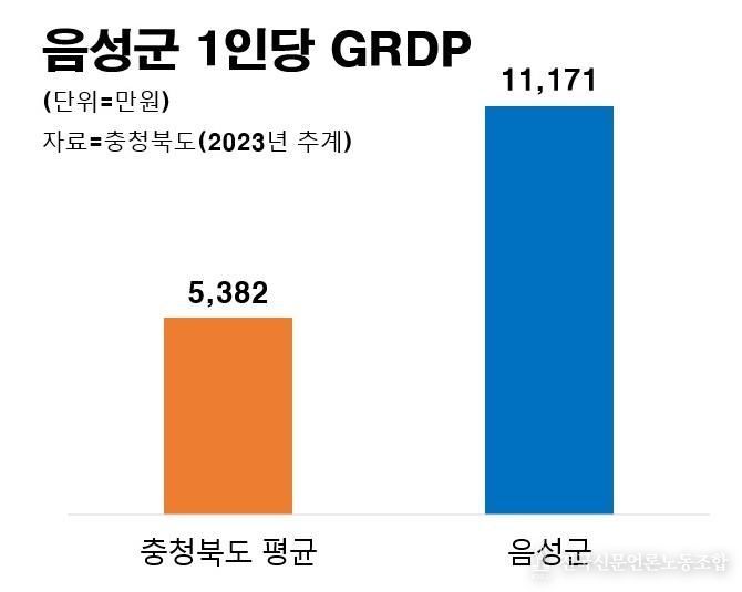충북도가 지난 20일 공표한 2023년 기준 ‘충청북도 시군단위 지역내총생산(GRDP)’ 추계결과, 음성군의 1인당 GRDP는 2022년보다 668만5천원 증가한 1억1171만8천원으로 나타났다. 이는 도내 평균(5천382만7천원) 대비 107.6% 높은 수준으로, 약 2배 이상 차이를 보였다.