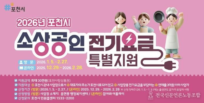 포천시 관계자는 “전기요금 부담 완화를 위한 이번 사업에 소상공인의 참여가 이어지고 있다”며 “아직 신청하지 못한 대상자는 기간 내 반드시 신청해 지원 혜택을 받으시기 바란다”고 말했다.