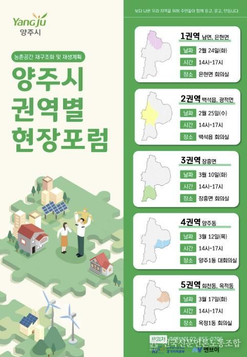 전국신문언론노동조합 김성길 기자 | 양주시가 오는 24일부터 3월 17일까지 5차례에 걸쳐 ‘농촌공간 재구조화 및 재생 기본계획’ 수립을 위한 권역별 주민현장포럼을 개최할 예정이다.
