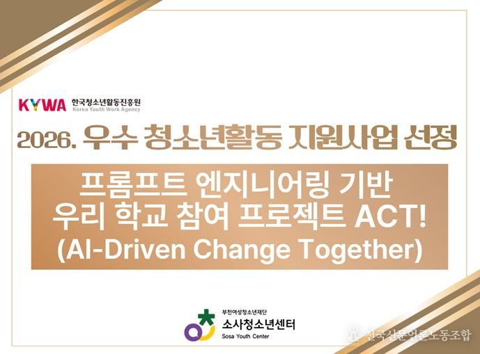 전국신문언론노동조합 김성길 기자 | 부천여성청소년재단이 운영하는 소사청소년센터는 한국청소년활동진흥원이 주관하는 ‘2026년 우수 청소년활동 프로그램 지원사업’ AI·디지털 분야에 선정됐다고 밝혔다.