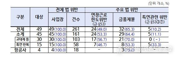 감독 결과, 4개소 전 사업장에서 총 18건의 법 위반 사항이 적발됐다. 주요 위반 내용으로는 ▴브리핑 시간 등을 제외하고 순수 비행시간만 근로시간으로 인정하는 등 야간근로수당 미지급 3개소(75.0%, 약 7억원), ▴기간제 승무원을 차별하여 비행수당 미지급 1개소(25.0%, 약 5억 5천만원), ▴산후 1년 미경과자 시간외 근로 한도 초과 2개소(50.0%) 등이 확인됐다.