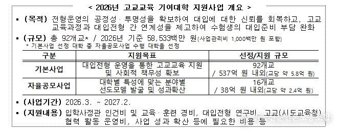 전국신문언론노동조합 강찬희 기자 | 교육부은 2월 24일, ‘2026년 고교교육 기여대학 지원사업 기본계획’을 발표한다.