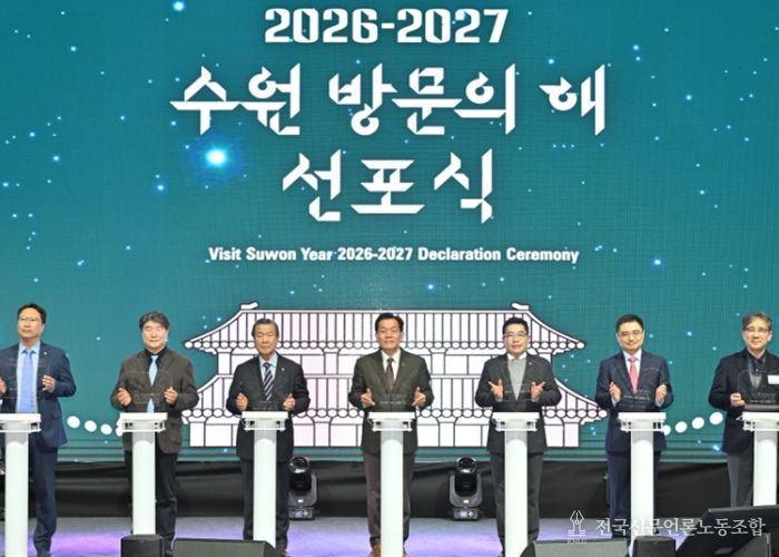 전국신문언론노동조합 김성길 기자 | 이재준 수원특례시장이 24일 수원컨벤션센터에서 열린 ‘2026-2027 수원 방문의 해’ 선포식에서 “수원의 문을 세계로 활짝 열겠다”고 말했다.