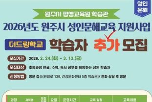 전국신문언론노동조합 강찬희 기자 | 원주시 학습관은 2026년 성인문해교육 지원사업 ‘더드림(The Dream)학교’의 성인 문해 기초 과목 학습자를 추가 모집한다.