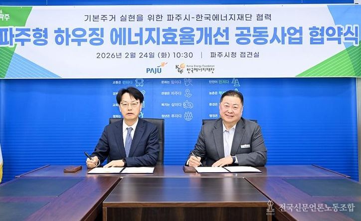 전국신문언론노동조합 김성길 기자 | 파주시는 지난 24일 한국에너지재단과 ‘기본주거 실현을 위한 파주형 하우징 에너지효율개선 공동사업’업무협약을 체결했다.