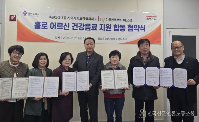 전국신문언론노동조합 김성길 기자 | 용인특례시 수지구 죽전1·2·3동 지역사회보장협의체는 25일 죽전2동 행정복지센터에서 ㈜hy 미금점과 ‘홀로어르신 건강음료 지원’ 사업 협약을 체결했다고 26일 밝혔다.