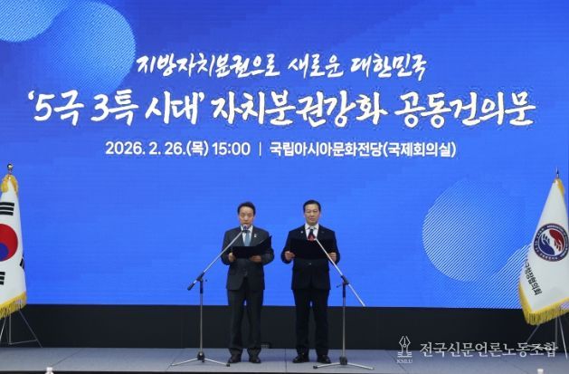 전국신문언론노동조합 강찬희 기자 | 대한민국시장·군수·구청장협의회는 2월 26일 광주 국립아시아문화전당에서 민선8기 4차년도 제3차 공동회장단회의를 개최하고,『5극3특 시대 자치분권 강화 공동건의문』을 발표했다.