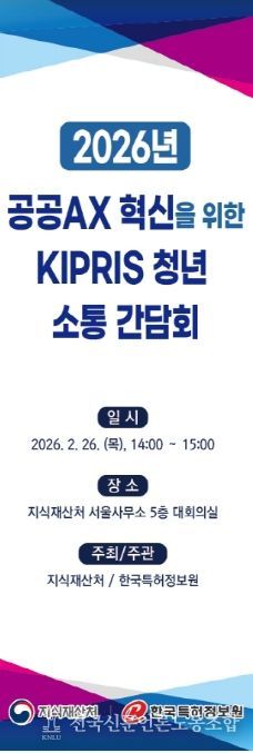전국신문언론노동조합 강찬희 기자 | 지식재산처는 2월 26일 14시, 한국지식재산센터(서울 강남구)에서 청년들의 참신한 시각을 통해 지식재산정보검색서비스(KIPRIS)의 발전 방향을 모색하는 'KIPRIS 청년 소통 간담회'를 개최한다고 밝혔다.