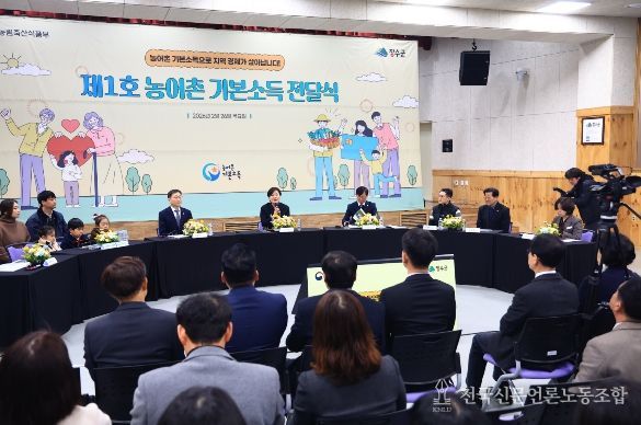 전국신문언론노동조합 강찬희 기자 | 농림축산식품부는 인구 소멸 위기 농어촌 지역의 주민을 대상으로 2월 26일 농어촌 기본소득을 첫 지급하게 됐다고 밝혔다. 지난 12월부터 농어촌 기본소득 신청을 받았던 시범사업 대상 10개 군은 2월 26일과 27일 양일에 걸쳐 지급 대상 주민에게 15만 원의 기본소득을 지역사랑상품권으로 지급한다. 송미령 장관은 26일 장수군에서 제1호 농어촌 기본소득 수령자에게 지역사랑상품권을 직접 전달했다.