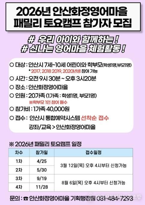 민진영 안산화정영어마을 원장(안산대학교 교양학부 교수)은 “패밀리 토요캠프는 가족이 함께 배우고 성장하는 경험에 의미를 두고 기획했다”며 “아이들이 말하기 중심 체험을 통해 영어 자신감을 키우고, 가정과 지역사회가 연계된 학습 환경 속에서 지속적으로 영어를 접할 수 있는 기반이 되길 바란다”고 말했다.