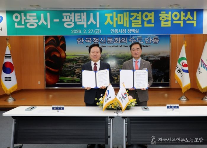 전국신문언론노동조합 강찬희 기자 | 안동시는 2월 27일 안동시청에서 평택시와 자매결연 협약을 체결하고 경제․문화․관광‧농업 등 전 분야에 걸친 상생발전의 닻을 올렸다.