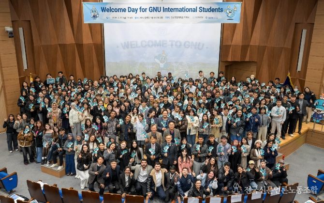 전국신문언론노동조합 강찬희 기자 | 경상국립대학교는 2026학년도 1학기에 외국인 유학생 244명이 입학했다고 밝혔다. 경상국립대학교 국제처는 2월 27일 오후 GNU국제관 파이어니어 오디토리엄에서 ‘2026학년도 1학기 외국인 유학생 신입생 오리엔테이션’을 개최했다. 행사에는 권진회 총장과 오재신 국제처장을 비롯해 외국인 유학생, 유학생 도우미(GNU Buddy), 교직원 등 320여 명이 참석했다.