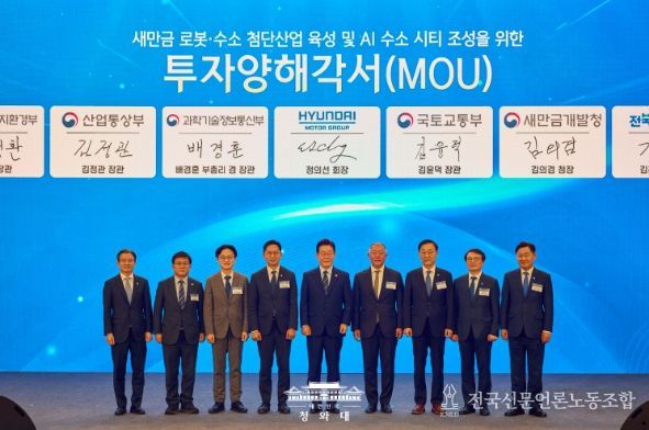 전국신문언론노동조합 강찬희 기자 | 이재명 대통령은 27일 새만금 로봇·수소·AI 시티 투자 협약식에 참석해 "현대자동차그룹의 혁신 역량 그리고 풍부한 자원이 합쳐진다면 새만금은 최적의 시너지를 발휘하는 기회의 땅이 될 수 있을 것으로 믿는다"고 밝혔다.